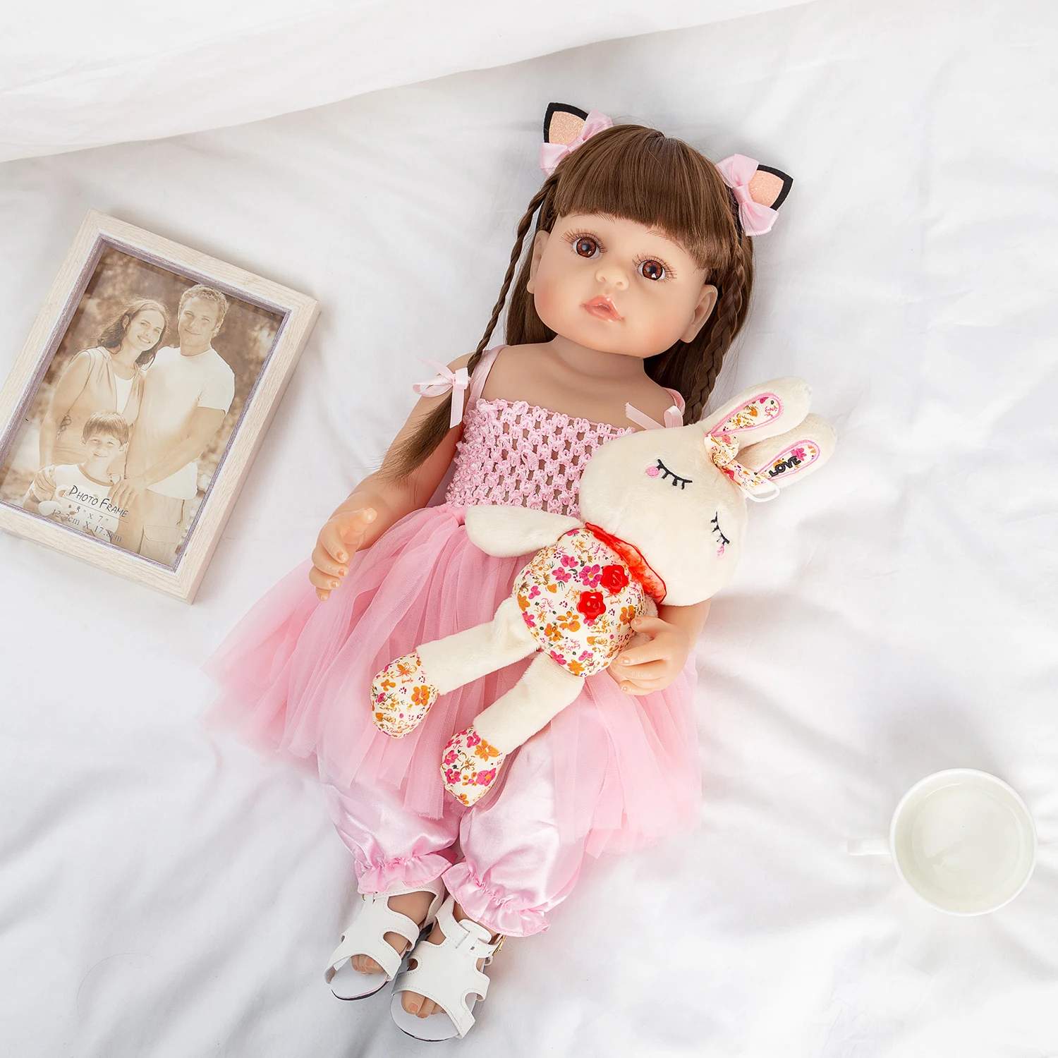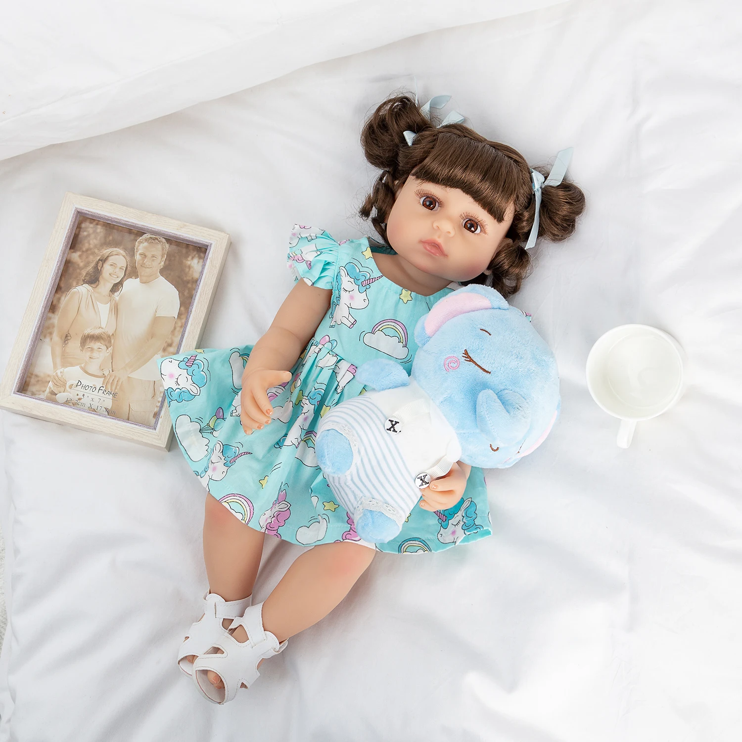 Estrutura: Cabeça e membros são todos feitos de vinil de silicone. Pode colocá-lo na água. Produção de matéria-prima importada de vinil macio, não tóxico; membros de bonecas podem ser ativos, podem sentir ou deitar, não podem ficar de pé, falar ou se alimentar.